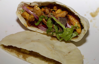 For Pita that didn`t puff up completely just apply the Tahini sauce on the top of the Pita and place the lettuce, onions, tomatoes and chicken then roll one side the bread over the stuffing and use a aluminium foil to wrap around. Repeat for all the remaining Pitas.