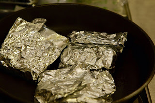 Take a skillet/frying pan and pour little oil. Drop the marinated fish into it and cook for 1 minute both the sides. Take out the fish and place on a tissue paper. Allow to cool down. Tear a square shape aluminium foil and place some masala first then the fish on top and finally some more masala on top of the fish. Carefully wrap the fish and all the sides should be properly sealed not allowing any steam to escape when we cook it. Repeat same for all the fillets.
